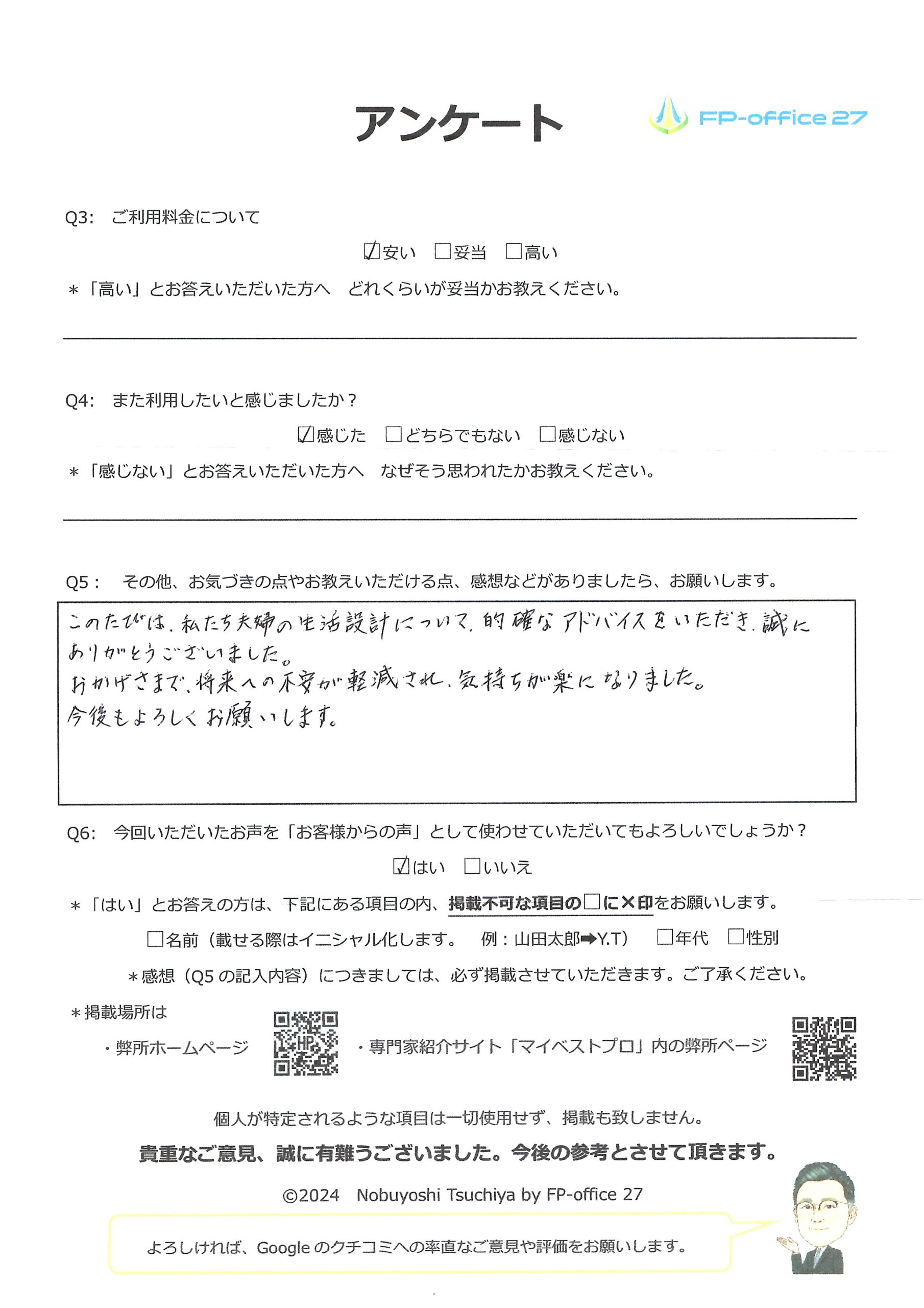 | ご依頼内容 | ・自分なりに立てたライフプランについて、確認とアドバイスを お願いしたい。 |